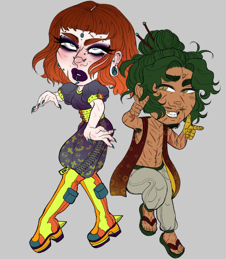 Each Include: two busts (front and back or two expressions of your choice) and one full body flat colored drawing. Flat color or gradient background, max of five props and accessories, complex clothing/armor, wings, fangs or tusks, and horns. You can request the references with detail notes, character stats and color palette as well.